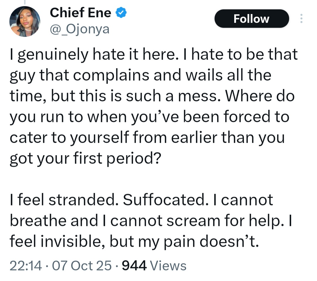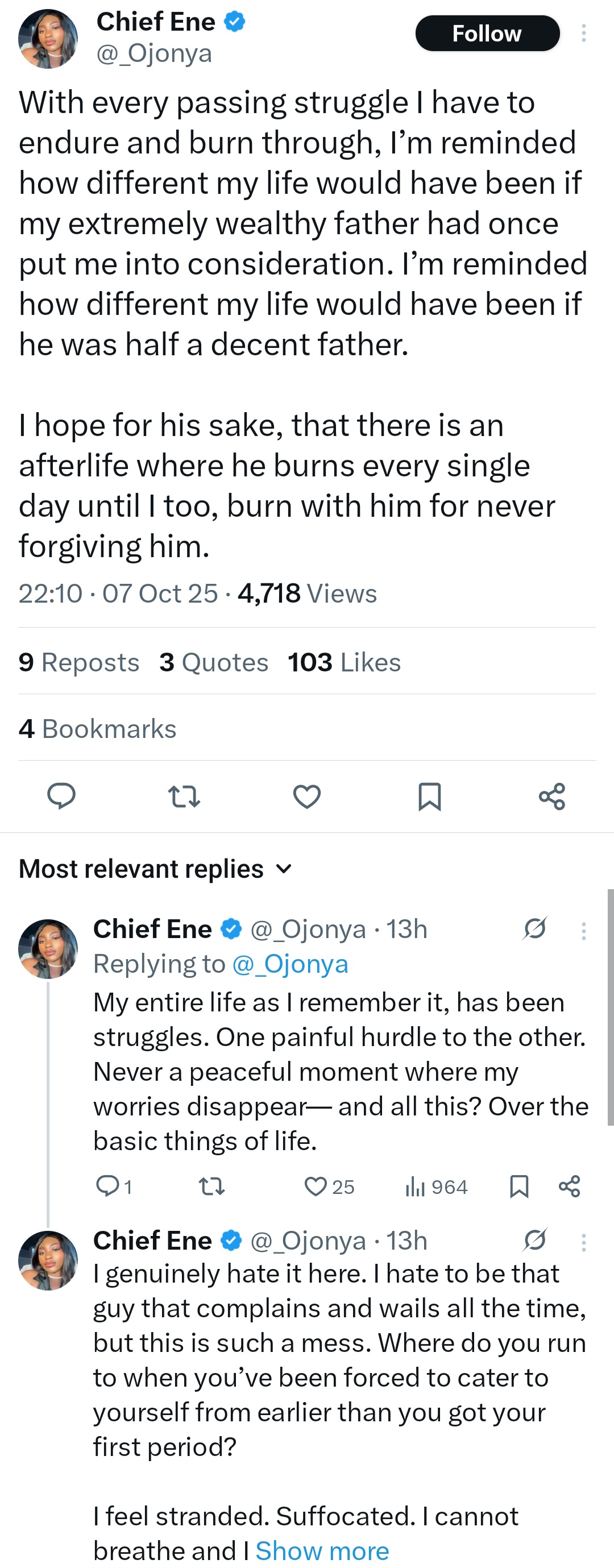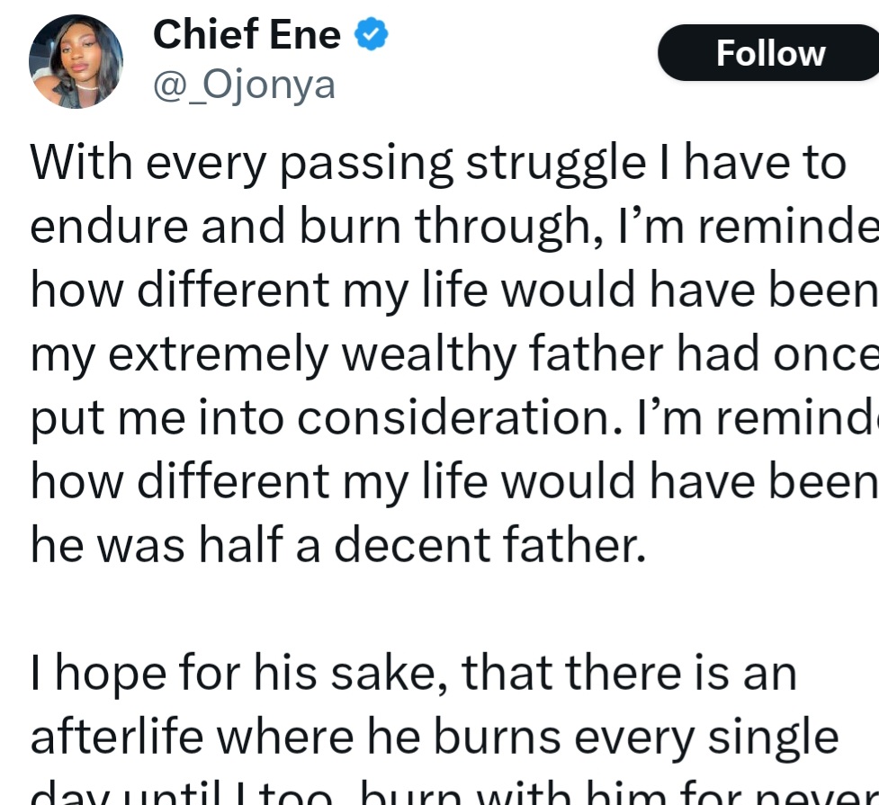 An SEO content writer has cursed her father on X. According to her, her struggles reminds her of how different her life would have been if her wealthy father had put her into consideration. She wrote: "With every passing struggle I have to endure and burn through, Im reminded how different my life would have been if my extremely wealthy father had once put me into consideration. Im reminded how different my life would have been if he was half a decent father. "I hope for his sake, that there is an afterlife where he burns every single day until I too, burn with him for never forgiving him. "My entire life as I remember it, has been struggles. One painful hurdle to the other. Never a peaceful moment where my worries disappear and all this? Over the basic things of life. "I genuinely hate it here. I hate to be that guy that complains and wails all the time, but this is such a mess. Where do you run to when youve been forced to cater to yourself from earlier than you got your first period? "I feel stranded. Suffocated. I cannot breathe and I cannot scream for help. I feel invisible, but my pain doesnt."