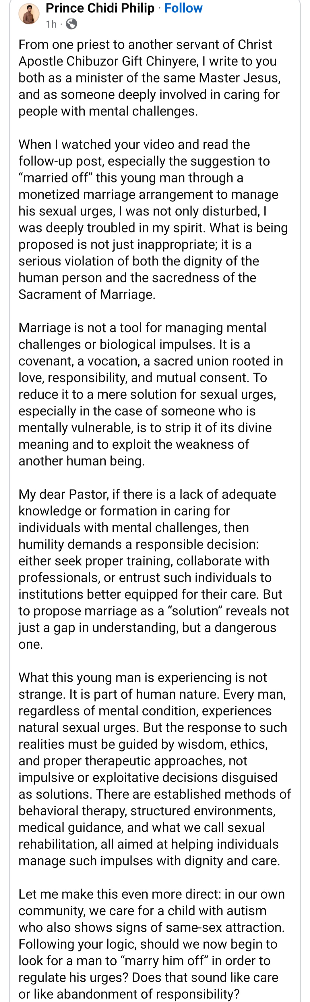 A Catholic Priest has told Chibuzor Gift Chinyere, the founder and pastor of Omega Power Ministries (OPM) that marrying off his adopted autistic son due to his uncontrollable sxual urge is not the solution. Pastor Chinyere had claimed that his adopted son who is autistic has troubles controlling his sxual urge among other children in the house. He claimed the boy gets an erection all the time and he does not want the boy to impregnate one of the children in the home. As a result, he is seeking an older woman he would pay to marry the autistic son and help curb his sxual urges. Responding, Catholic Priest Father Prince Chidi Philip told Pastor Chibuzor that his autistic son needs protection, not marriage. The Priest wrote: From one priest to another servant of Christ Apostle Chibuzor Gift Chinyere, I write to you both as a minister of the same Master Jesus, and as someone deeply involved in caring for people with mental challenges. "When I watched your video and read the follow-up post, especially the suggestion to married off this young man through a monetized marriage arrangement to manage his sxual urges, I was not only disturbed, I was deeply troubled in my spirit. What is being proposed is not just inappropriate; it is a serious violation of both the dignity of the human person and the sacredness of the Sacrament of Marriage. "Marriage is not a tool for managing mental challenges or biological impulses. It is a covenant, a vocation, a sacred union rooted in love, responsibility, and mutual consent. To reduce it to a mere solution for sxual urges, especially in the case of someone who is mentally vulnerable, is to strip it of its divine meaning and to exploit the weakness of another human being. "My dear Pastor, if there is a lack of adequate knowledge or formation in caring for individuals with mental challenges, then humility demands a responsible decision: either seek proper training, collaborate with professionals, or entrust such individuals to institutions better equipped for their care. But to propose marriage as a solution reveals not just a gap in understanding, but a dangerous one. "What this young man is experiencing is not strange. It is part of human nature. Every man, regardless of mental condition, experiences natural sxual urges. But the response to such realities must be guided by wisdom, ethics, and proper therapeutic approaches, not impulsive or exploitative decisions disguised as solutions. There are established methods of behavioral therapy, structured environments, medical guidance, and what we call sxual rehabilitation, all aimed at helping individuals manage such impulses with dignity and care. "Let me make this even more direct: in our own community, we care for a child with autism who also shows signs of same-sx attraction. Following your logic, should we now begin to look for a man to marry him off in order to regulate his urges? Does that sound like care or like abandonment of responsibility? "I also found it deeply inappropriate and disturbing that your post went into explicit and unnecessary descriptions of this young mans sxual condition. Such details do not educate; they dehumanize. They expose rather than protect. At a point, I genuinely hoped your account had been compromised, because it is difficult to reconcile such content with the responsibility of someone entrusted with vulnerable lives. "Those who are mentally challenged are not burdens to be managed or problems to be solved. They are persons to be loved, protected, accompanied, and dignified. They need fathers, not opportunists; shepherds, not strategists of convenience. "Marrying off a vulnerable individual under such circumstances is not just ethically wrong, it is spiritually irresponsible. It borders on exploitation masked as charity. "Please, protect these children. Be a true spiritual father to them. Walk with them patiently, even when it is difficult. And if you have reached your limit, there is no shame in acknowledging that and seeking better-equipped hands. What is unacceptable is turning their vulnerability into an experiment. "Let us not confuse visibility with impact, or popularity with truth. Not everything that trends is right, and not everything that draws attention is worthy of imitation. This is not an attack, it is a call to conscience."