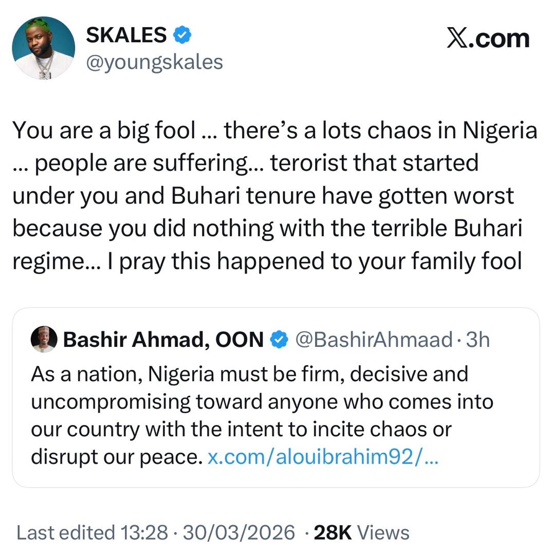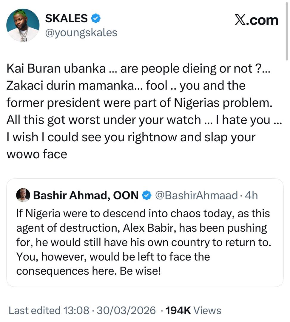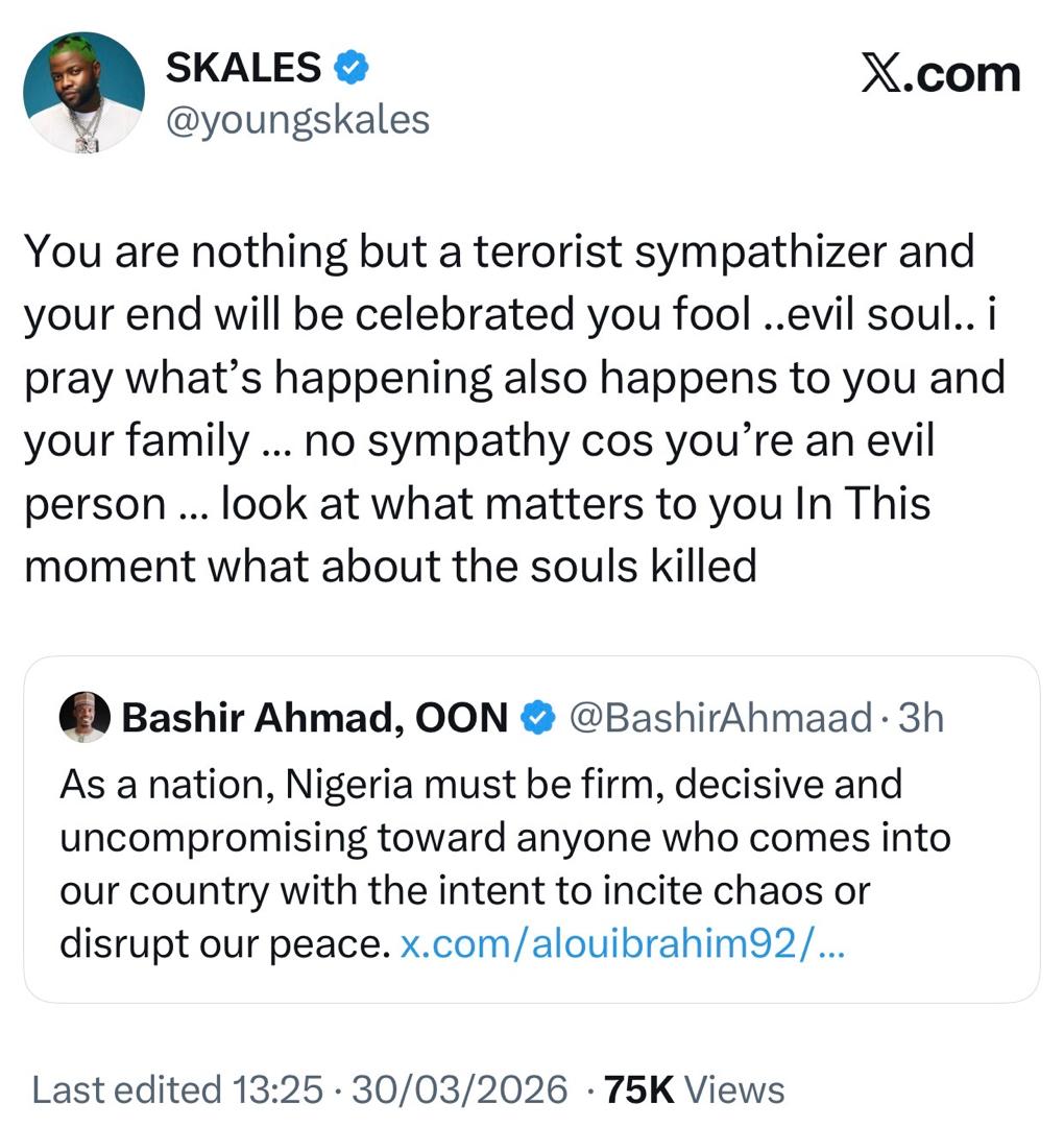 Singer Skales has dragged former Presidential aide, Bashir Ahmad, on social media over his recent comments about US Missionary, Alex Barbir. Earlier today, Alex shared a video on X calling out President Tinubu over the fresh attacks in Jos, Plateau state. The attack took place hours after Christians celebrated Palms Sunday. Over 10 persons have been confirmed de@d in the attack. Alex in his post, stated that President Tinubu is in Aso Rock doing nothing and continues to deny their is a Christian genocide in Nigeria. Read here. Reacting to Alex's post, Bashir accused the US Missionary of spreading hate across Nigeria and called on security agents to investigate and arrest him. Skales felt offended by Bashir's comment and took to his X handle to blast him. According to Skales, Bashir has shown no compassion for those that k!lled in the attack but was worried about what the US Missionary had to say. _1774882708.jpeg)