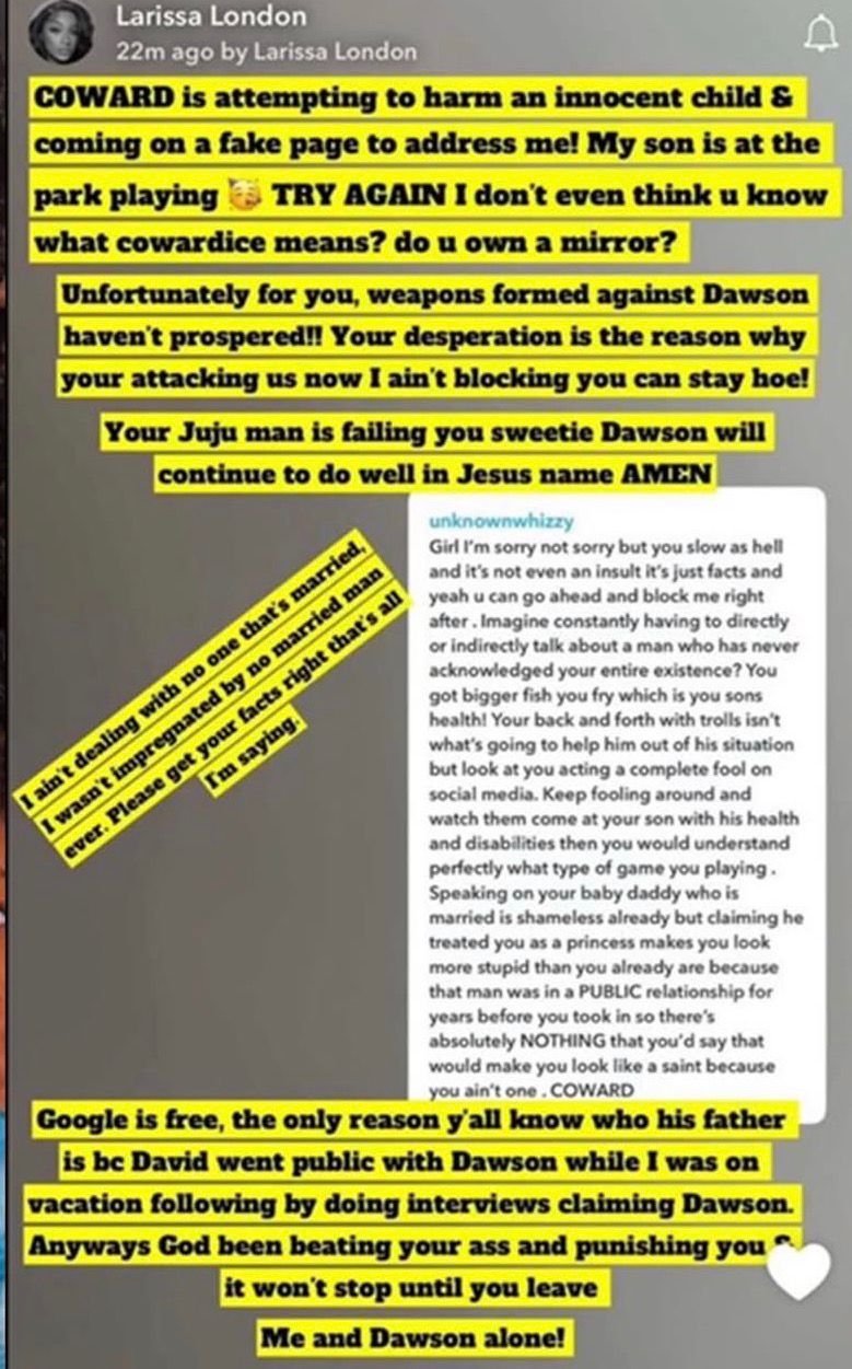 Larissa London, the mother of Davido's son, Dawson, has dismissed claims that she got pregnant for the singer while he was married to his wife, Chioma. She gave the clarification during a Question and Answer session on Snapchat on Sunday, April 26. A follower of hers had mentioned to her that she keeps throwing shade at the father of her son who has never claimed her publicly.The troll stated that she knew Davido was in a public relationship but yet she still went ahead to get pregnant and welcomed a son with him. Responding to the fan, Larrissa said she didnt get pregnant for a married man and asked neitzens to get their facts right. She also claimed an unamed person was using a fake page to troll her and suggested that the same person has been trying to use diabolic powers to att@ck her son, Dawson, but has failed..Davido and Larissa welcomed Dawson in 2020.