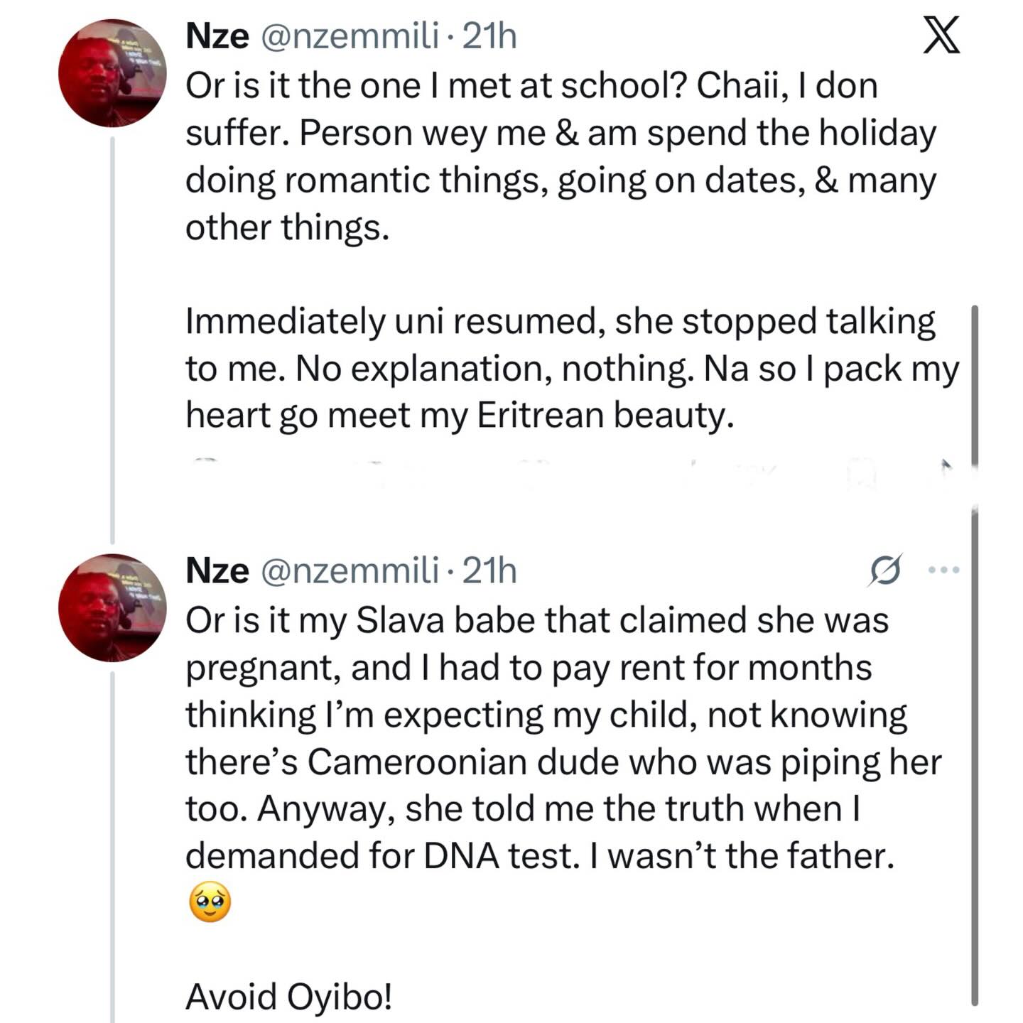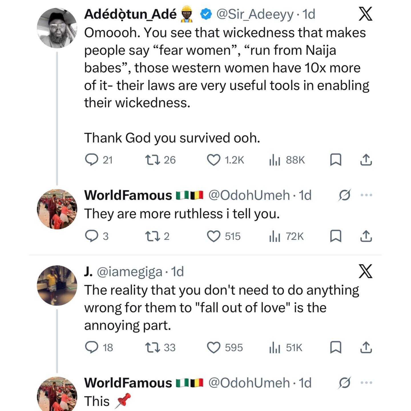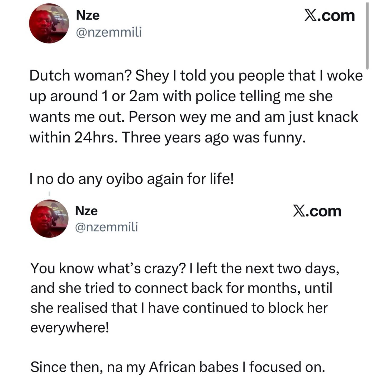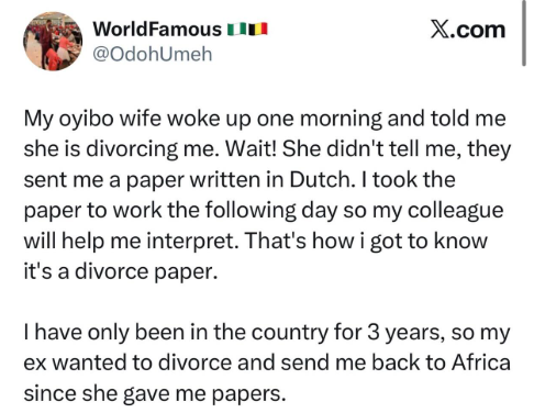 Nigerian men who have been in romantic relationships with white ladies have taken to social media to share stories of how their white spouses served them breakfast' with no reason at all. It all started when an X user @odohumeh shared the story of how he received divorce papers from his Dutch wife without l prior notice from her. According to him, they woke up one morning and she said she was divorcing him. He mentioned that the his saving grace was that the law, unknown to her, had been amended to grant residency to a spouse who has been married for three years and above even if a divorce is granted. He said the issue tested him greatly but he found peace after realizing he could stay in the country even after divorce. . He said his Dutch wife tried to get back with him later but he rejected her. My oyibo wife woke up one morning and told me she is divorcing me. Wait! She didn't tell me, they sent me a paper written in Dutch. I took the paper to work the following day so my colleague will help me interpret. That's how i got to know it's a divorce paper. I have only been in the country for 3 years, so my ex wanted to divorce and send me back to Africa since she gave me papers. Turns out, as we later found out, that the country has amended their law and now allows one to complete their stay as stipulated on their paper, so long the marriage lasted at least 3 years (I had 5 years papers then). Upon realization, my ex tried to mend fences and get us back, but it's too late. I was afraid. She owned me. I submitted to her whims and caprices because I feared i would lose my right to stay if she divorces me. When the divorce papers came i went into depression. I began to lose weight. Where do i begin from? How do i go back home and face my people? I pleaded with her but it fell on deaf ears. She even booked a one-way ticket for me. She said it's her own little way of helping me transition to my new reality. You need to see her disappointed when we found out i could stay. I moved out and rented my own space-far from her and her troubles. It's been years now. That period really tested me but i thank God for God.''Responding to his post, another Nigerian man recounted how hours after having s#x with his white spouse, she called in the police to evict him from her apartment. He said the episode left him scarred and that he now focuses only on dating African women.