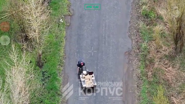 Ukrainian soldiers saved an elderly womans life by asking her to climb on the back of a robot. The woman, 72, was seen by an aerial drone walking between de@d bodies on a bullet-riddled road near the city of Lyman, Ukraine. Aerial footage shows the unnamed woman leaning on two walking sticks as she makes her way through the region ravaged by Russian fighting. Fighters from the 60th Separate Mechanised Brigade then launched a rescue mission using an unmanned ground system unit called Cerberus. The unit shared a video on social media showing one of the fighters watching the live feed as the woman stumbled.